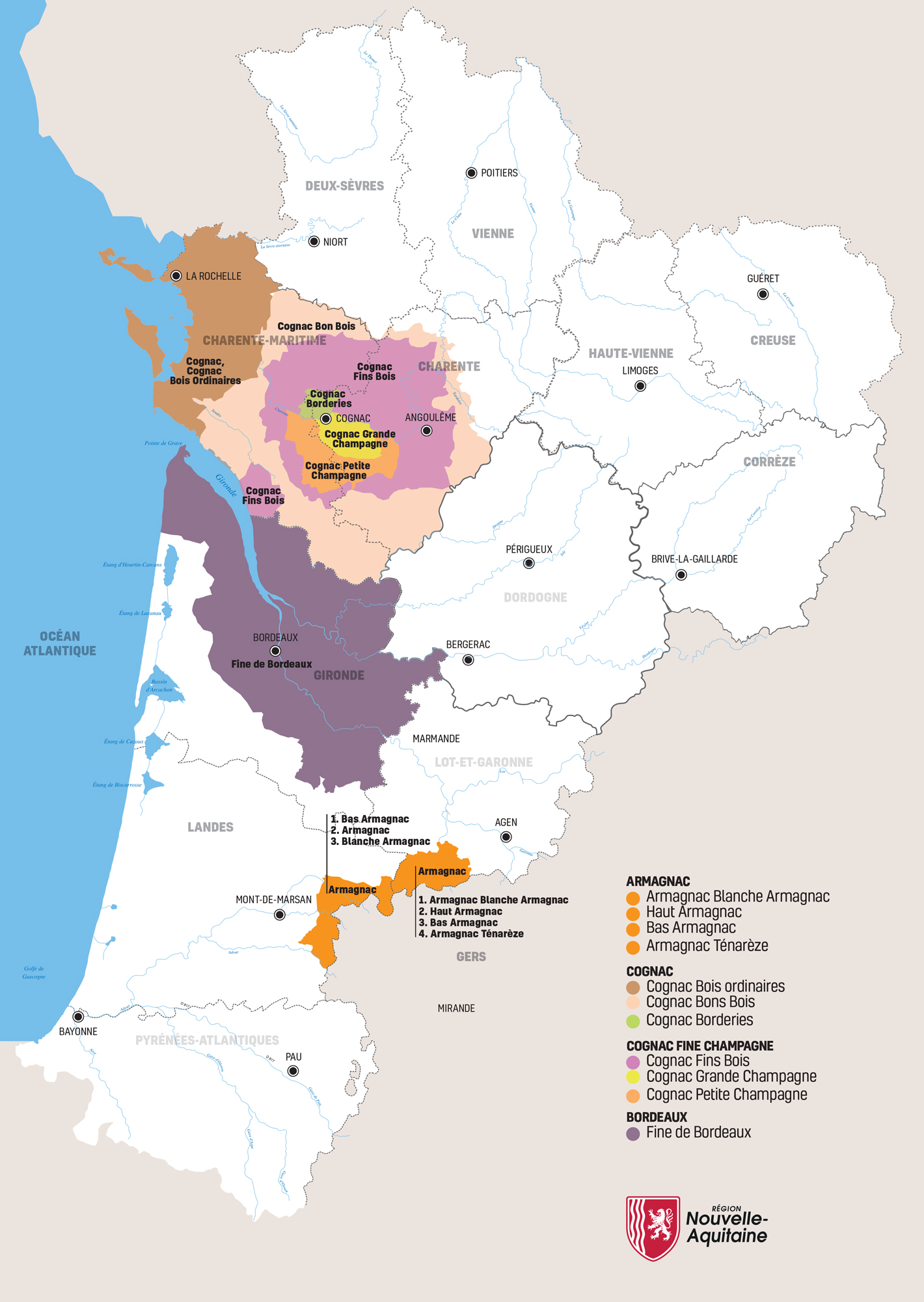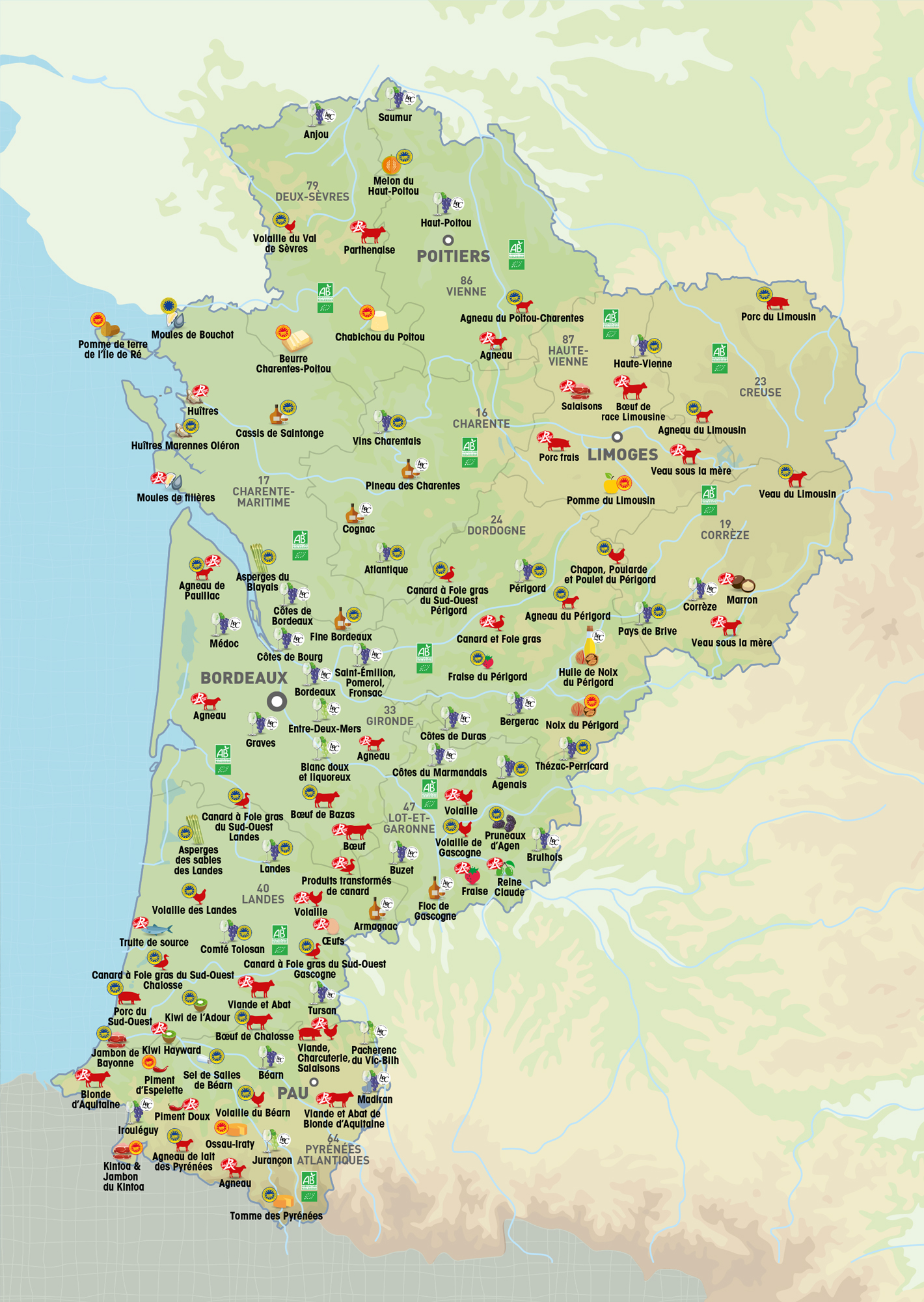 La région Nouvelle-Aquitaine est la 1ère région française pour les productions de qualité : Vins de Bordeaux AOC, Cognac AOC, Piment d’Espelette AOP, Chabichou du Poitou AOP, Bœuf de race Limousine Label Rouge… Elle bénéficie d’une agriculture riche et variée, et de savoir-faire reconnus dans le monde entier.